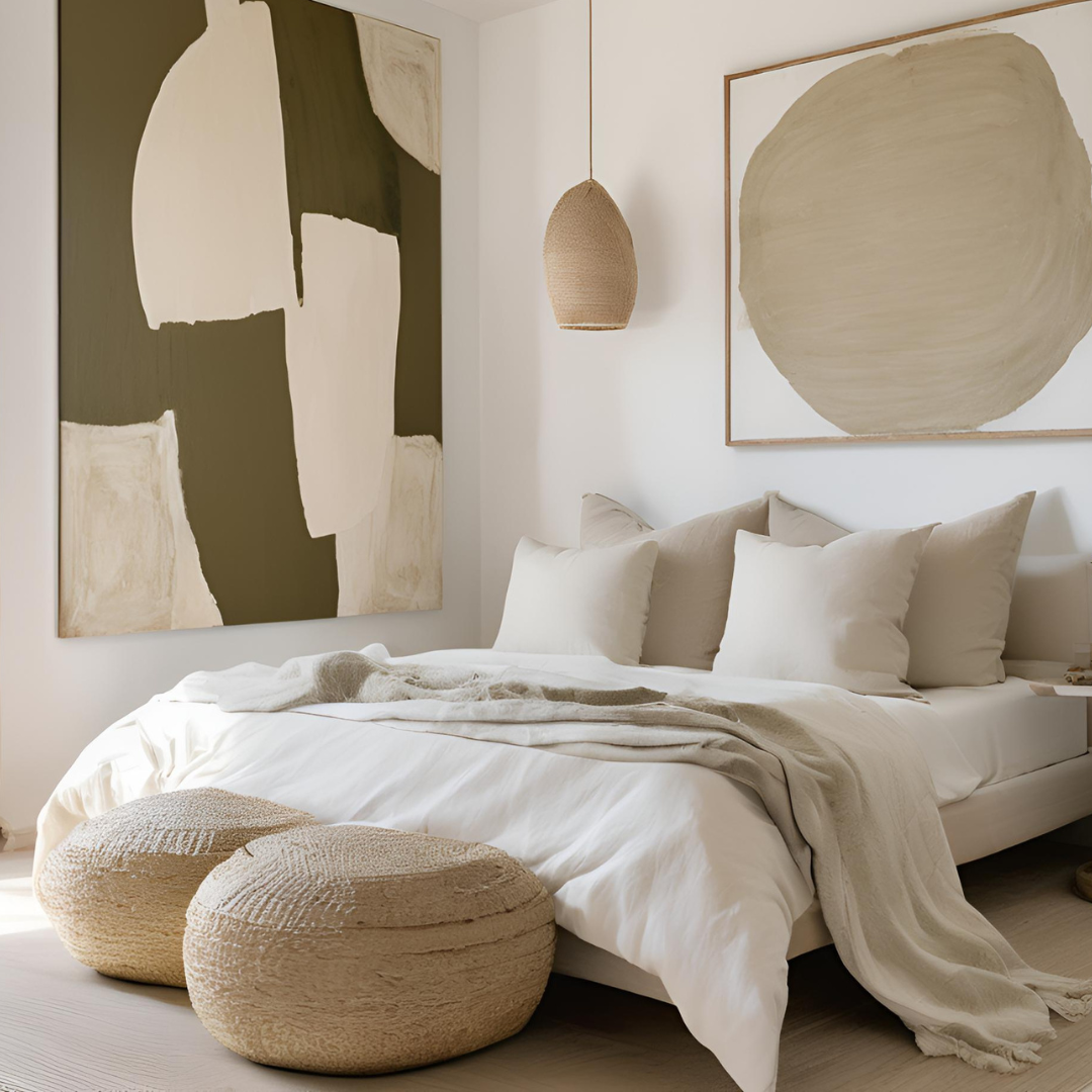 Instead of ornate, gilded frames, opt for simple wooden or matte black frames to keep the look modern. Art should be thoughtfully placed—above the bed, leaning against the wall on a console table, or in a curated gallery-style arrangement with other neutral-toned pieces.