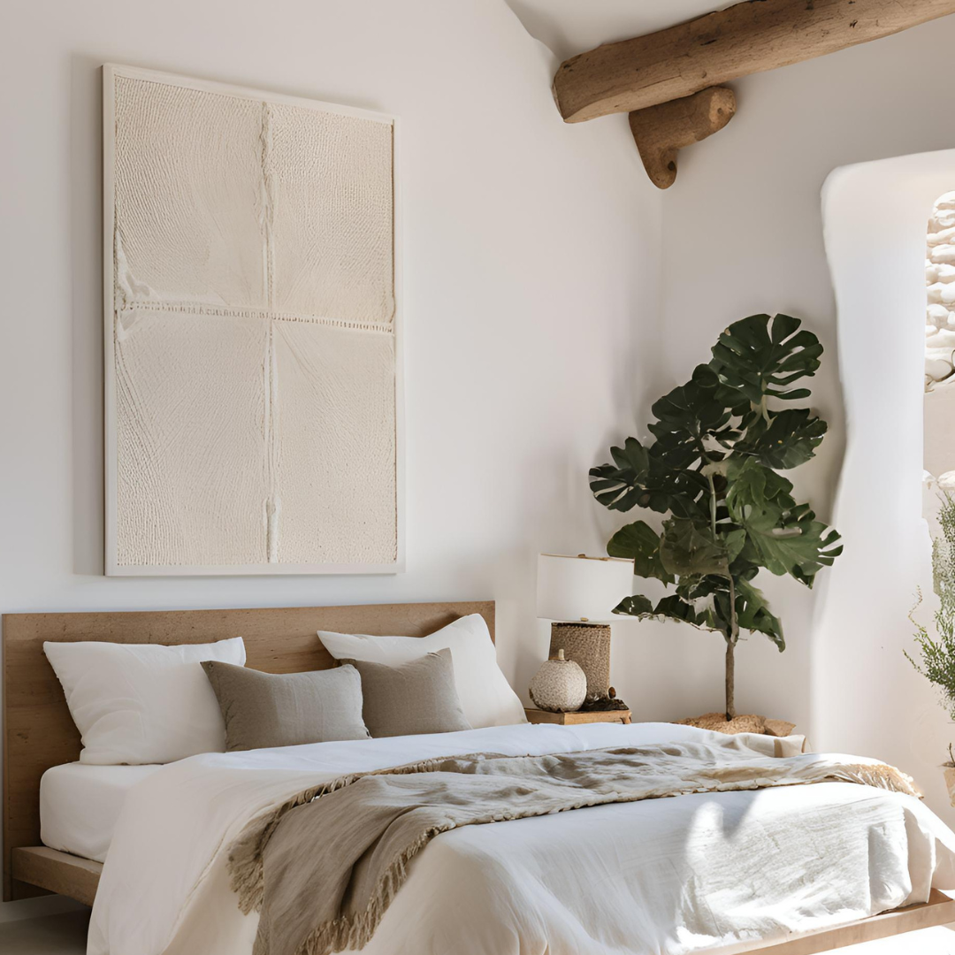 Look for wall art with fluid, abstract forms, minimalist brushstrokes, or textured canvases that echo the natural elements of the space. Pieces made with plaster, linen, or handmade paper add subtle dimension and an organic feel.